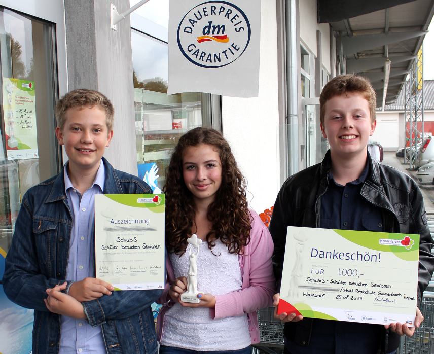 25.08.2014 Heute wurden im Waldbröler dm-Markt die regionalen Preisträger der Initiative "HelferHerzen" geehrt - und wir gehörten dazu! Unter deutschlandweit 9.000 und in der Region 38 Bewerbern wurde unser Projekt gemeinsam mit vier weiteren Teilnehmern aus der Region Oberberg/Olpe/Siegen ausgewählt und mit einem Preisgeld von jeweils 1.000 Euro belohnt. Als besondere Anerkennung erhielten alle Gewinner außerdem eine eigens für diesen Wettbewerb geschaffene Skulptur der Karlsruher Künstlerin Hannelore Langhans.