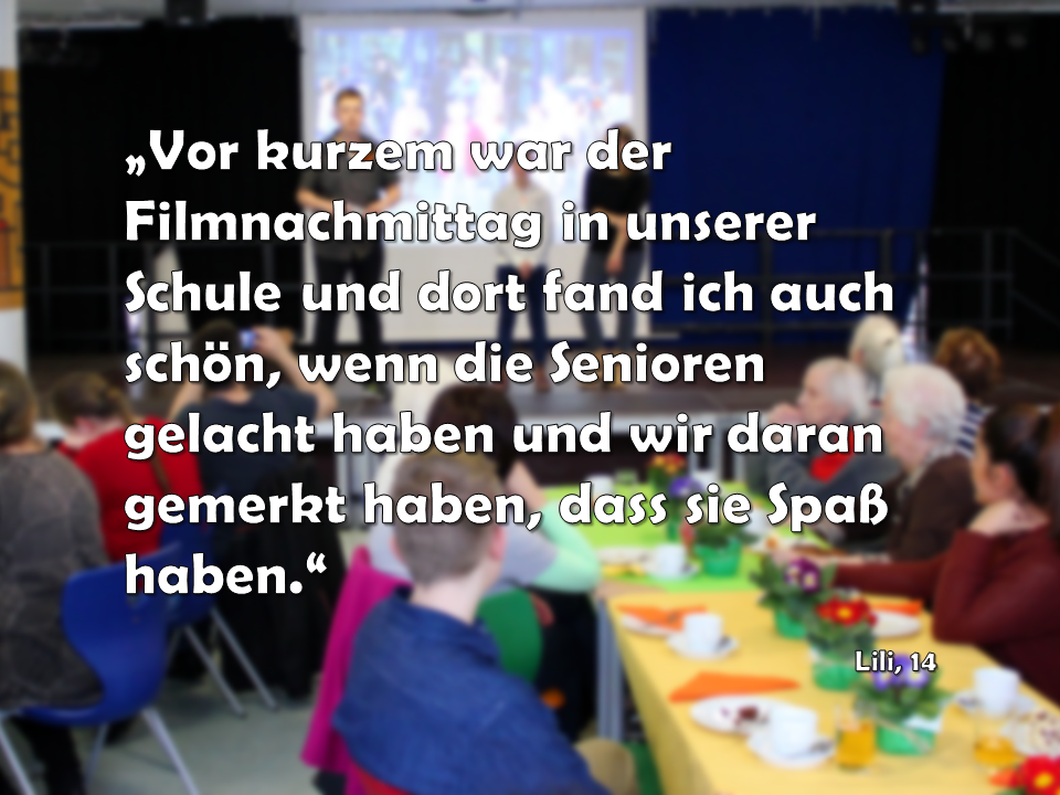 19.03.2014 "Er kanns nicht lassen - und wir auch nicht!" - Unter diesem Motto stand der diesjährige Filmnachmittag für Senioren an unserer Realschule Gummersbach-Hepel.Auch in diesem Jahr hatten engagierte Schülerinnen und Schüler der Klassen 7 und 8 im Rahmen unseres Projektes „Schüler besuchen Senioren“ Bewohner aus mit der Schule kooperierenden Seniorenheimen zu einem nostalgischen Kinoerlebnis bei Kaffee und selbstgebackenem Kuchen eingeladen.